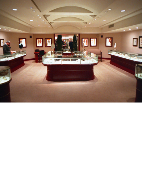 Intensely focused fiber optic lighting was installed inside the casework in minimalist fixtures to create heightened sparkling of the gemstones. LED lighting techniques were also used in the space, stylized ceiling, and wall display cases to further enhance the drama.
