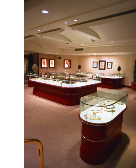 The goal in this retail space was to dramatize the jewellry and create a rich setting for it. CDG used a strategy of intense lighting focused at the jewellry and sensuous shaping of the space.